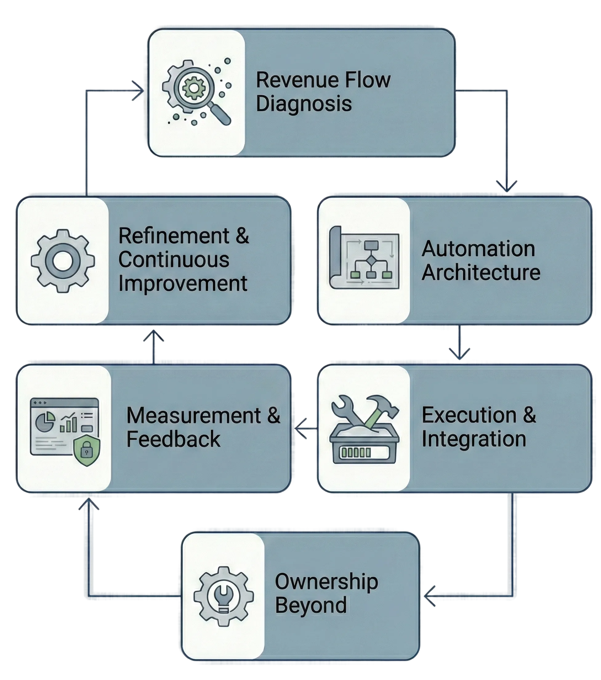 Our approach focuses on understanding how revenue actually flows through your organization — then designing automation that enforces consistency, reduces friction, and adapts as your go-to-market strategy evolves.
