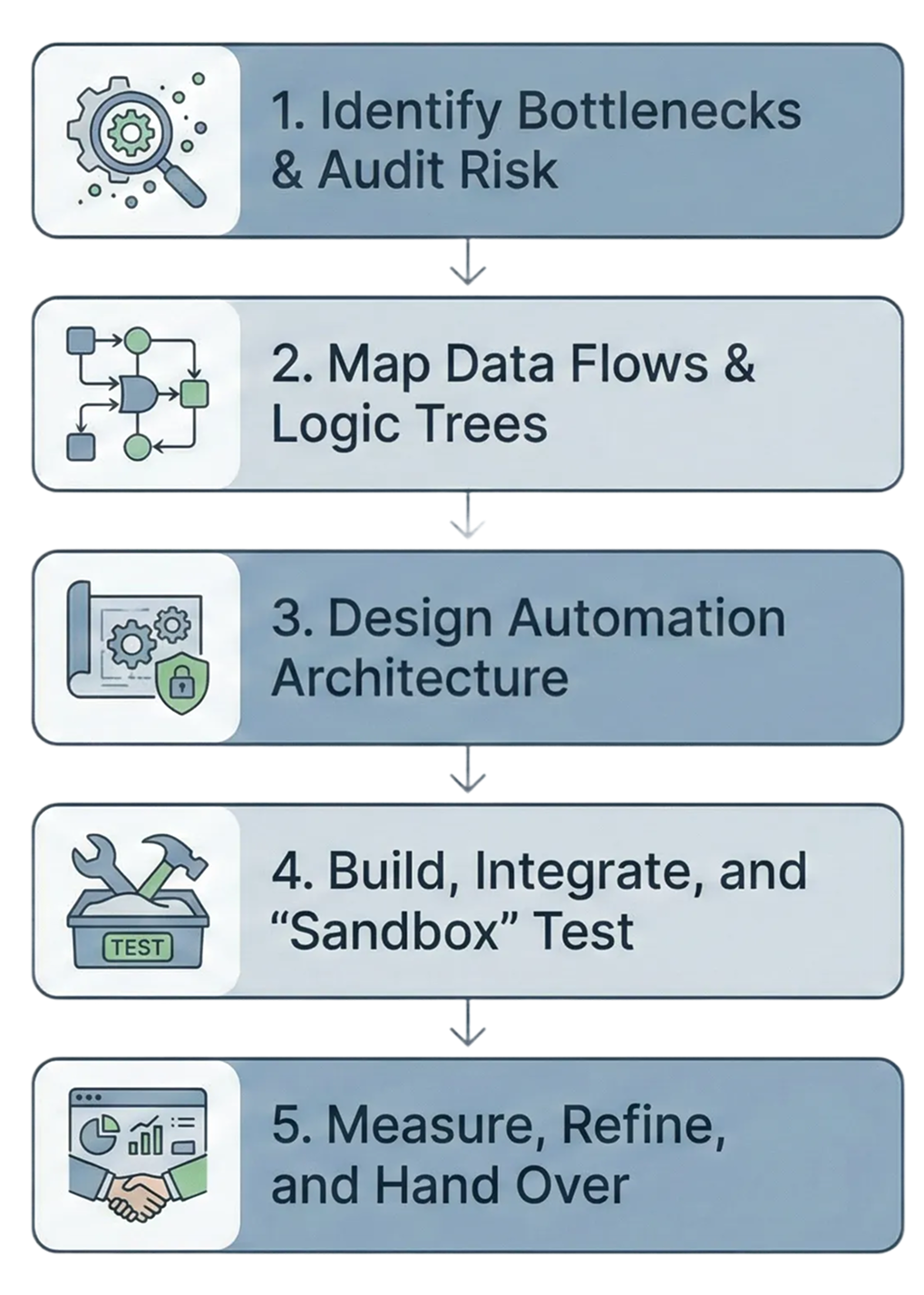 We do not believe in "move fast and break things" when it comes to your operations. We believe in measured, architectural change starting with an impactful software discovery phase. Operational automation projects follow a structured process designed to minimize risk while maximizing system resilience.