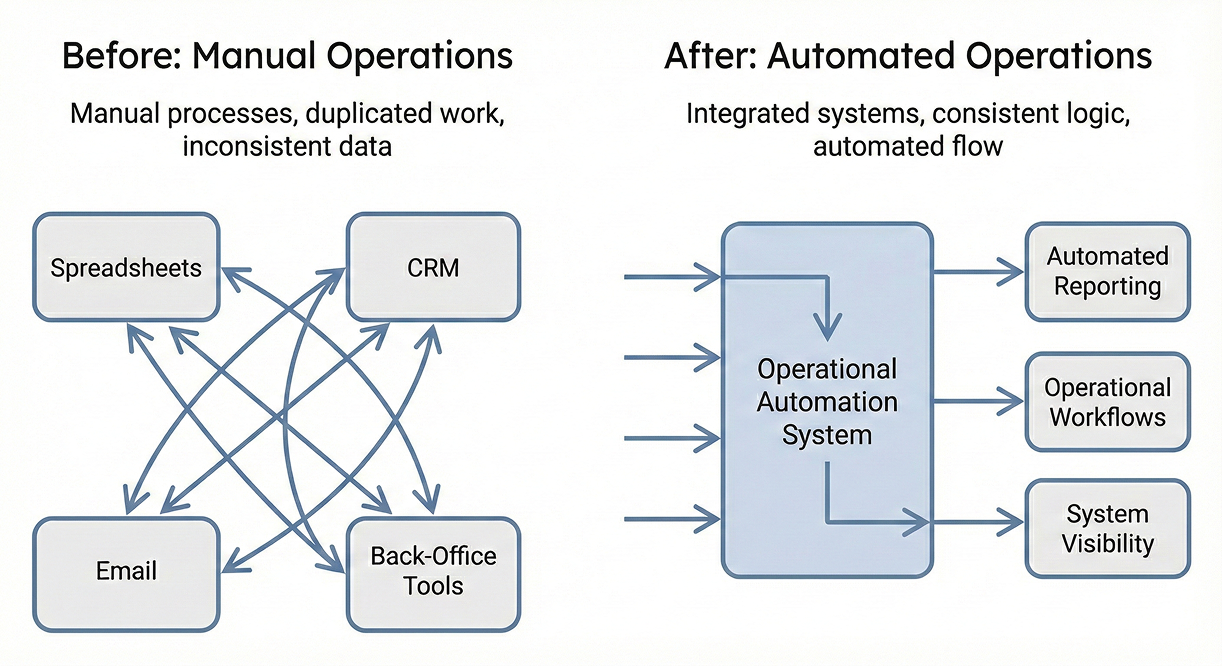If this feels familiar, the diagnostic assessment at the bottom of the page can help you quickly assess whether automation is likely to create real leverage for your operations.