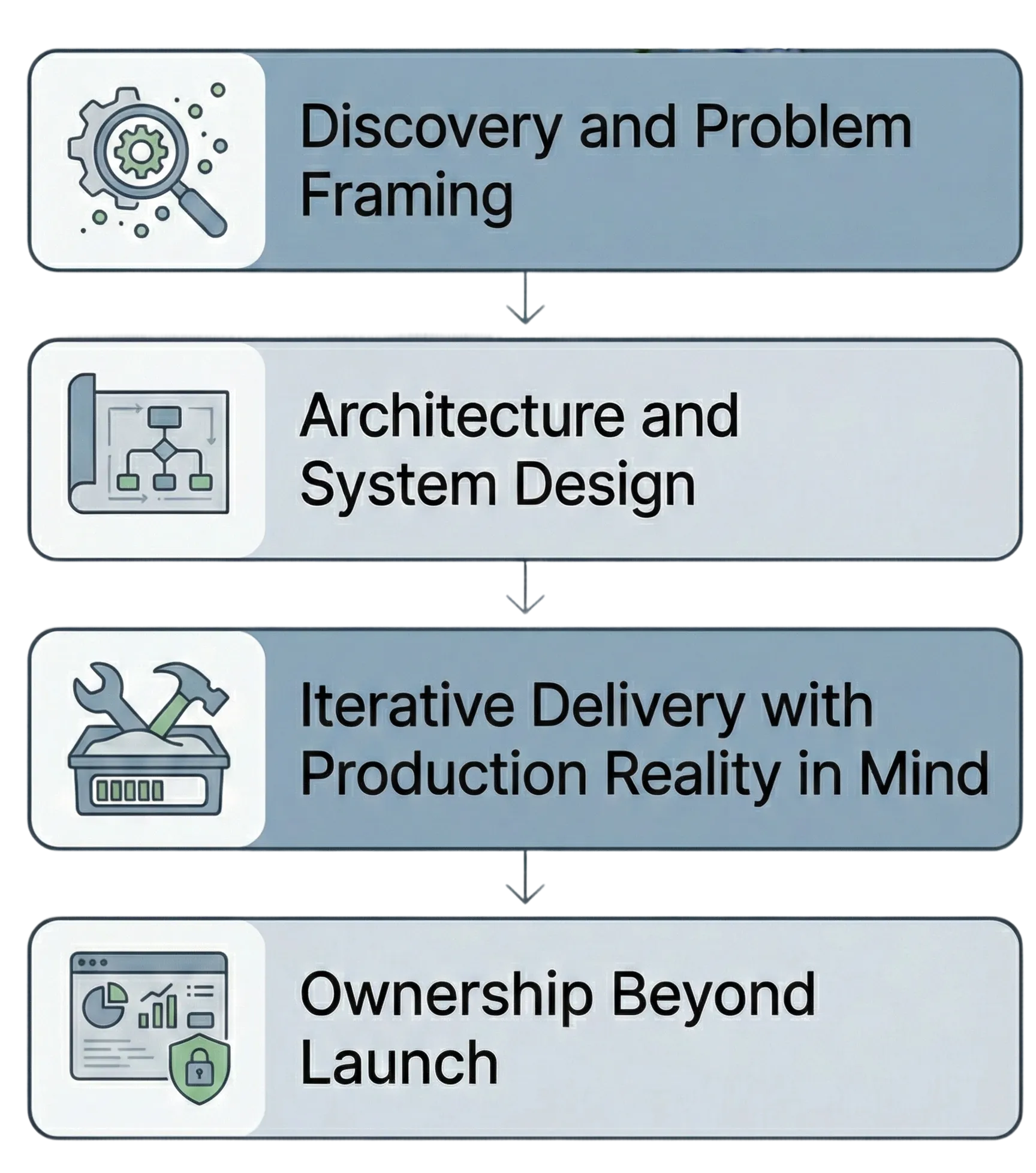 Building software that lasts isn’t about moving slower — it’s about making the right decisions early and validating them continuously. Our approach is designed to reduce risk, preserve momentum, and ensure that systems remain adaptable as products evolve.